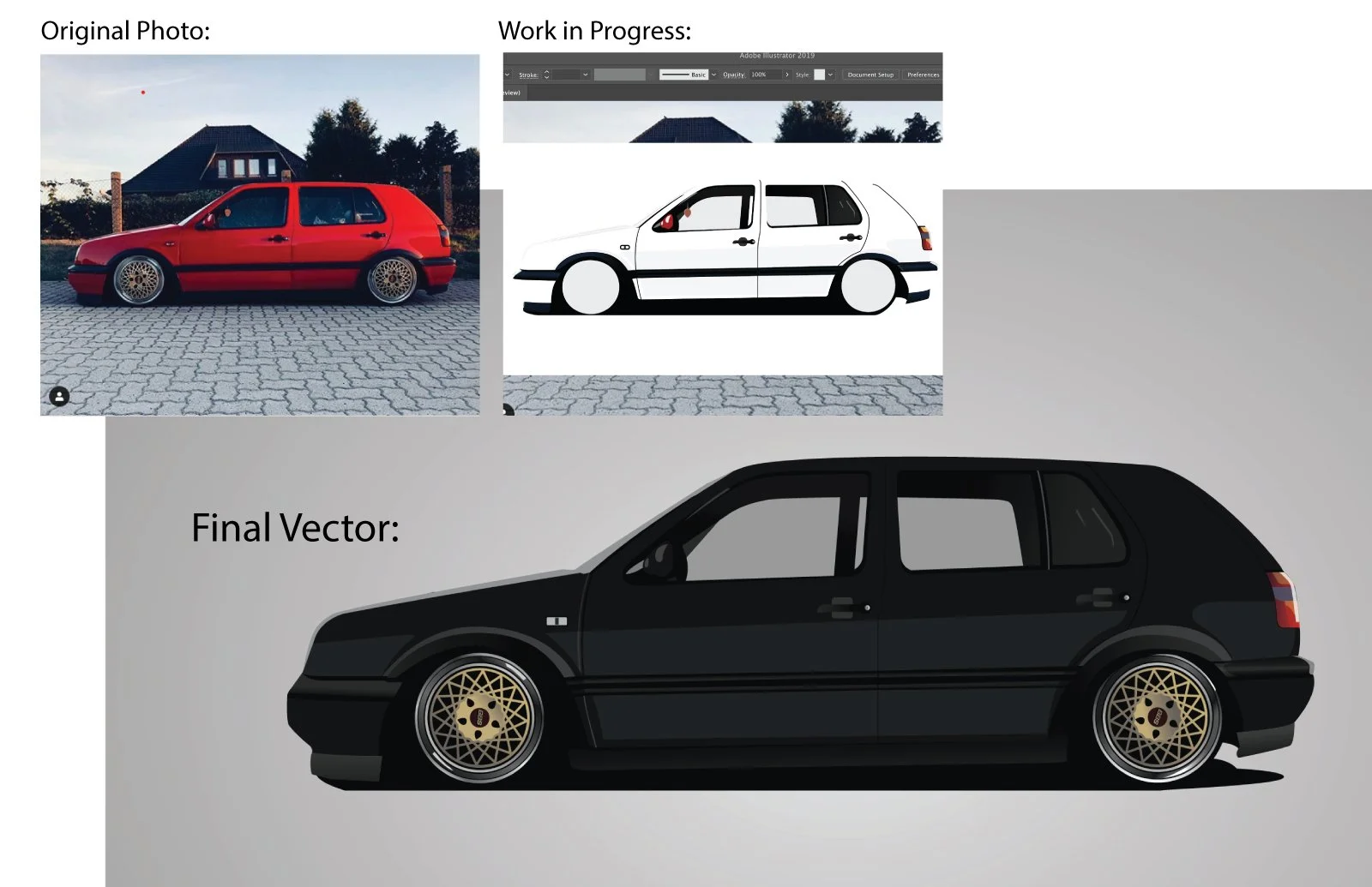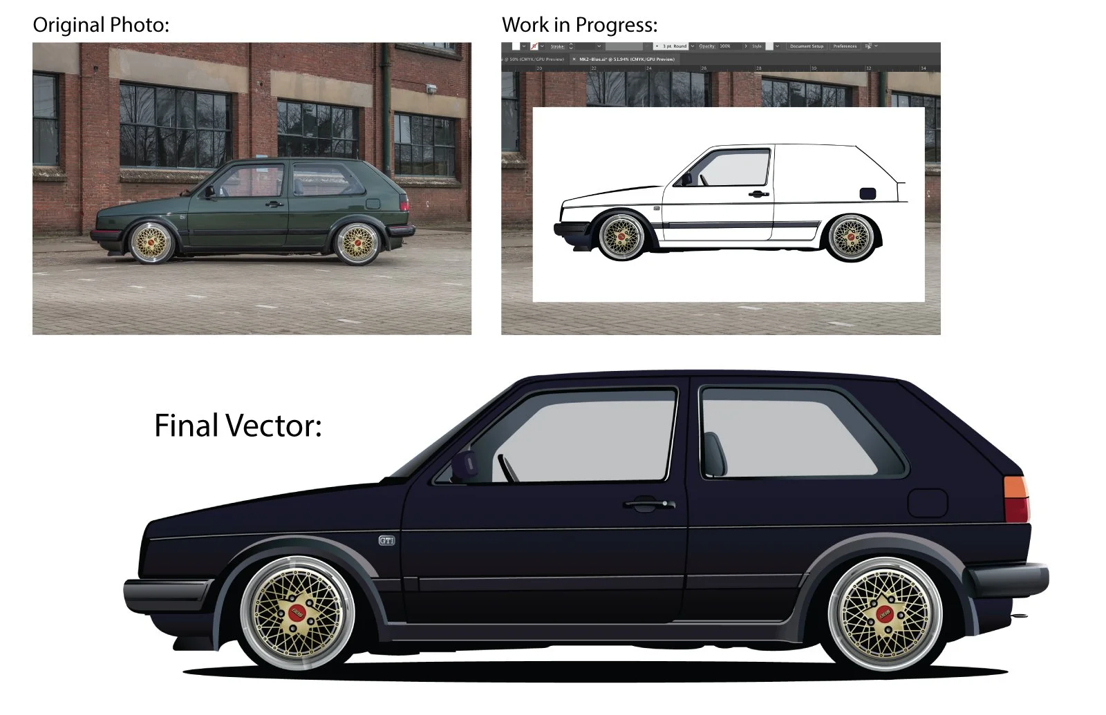 Full vector design of client’s beloved VW cars based on images provided. Vectorize virtually any image! Custom vectors give multiple perks: print-ready files to send straight to a decorator or print shop, call out specific colors and limit colors to save money on printing and get consistent colors across all mediums, scale the lossless design as large as you want without losing any detail.